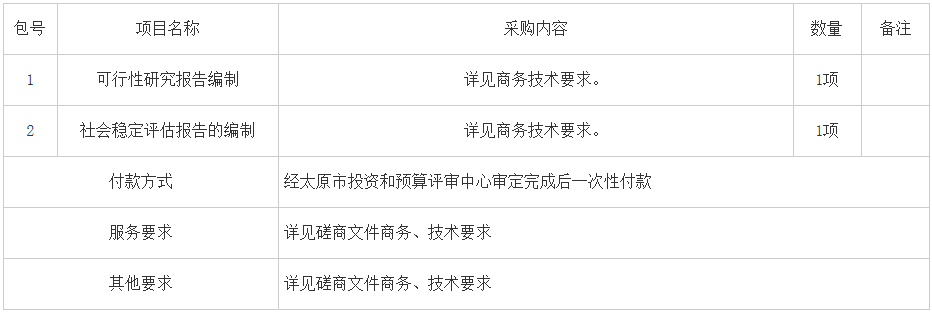 项目合计预算:200000.00元,其中1包:可行性研究报告编制服务60000元;2包:社会稳定评估报告编制服务140000.00元,具体支付以太原市投资和预算评审中心审定金额为准。