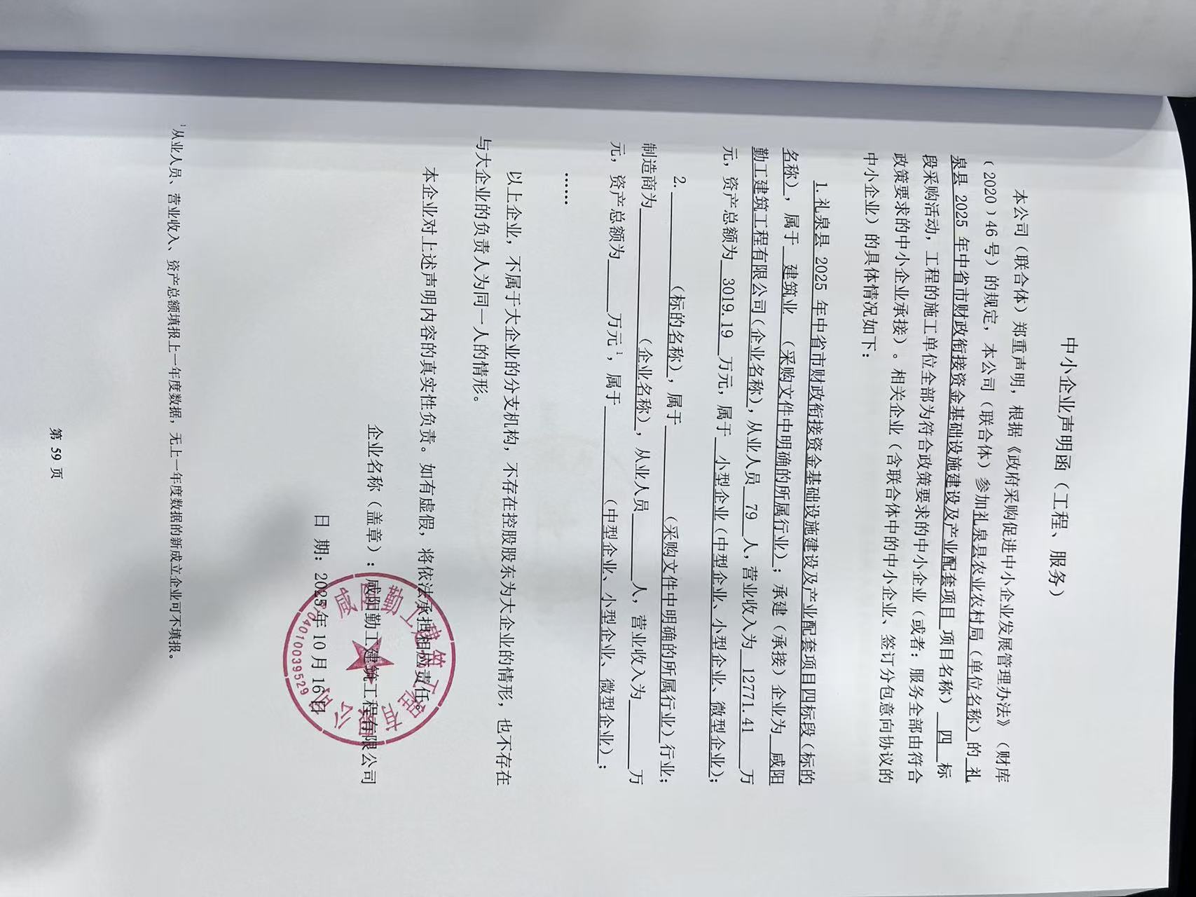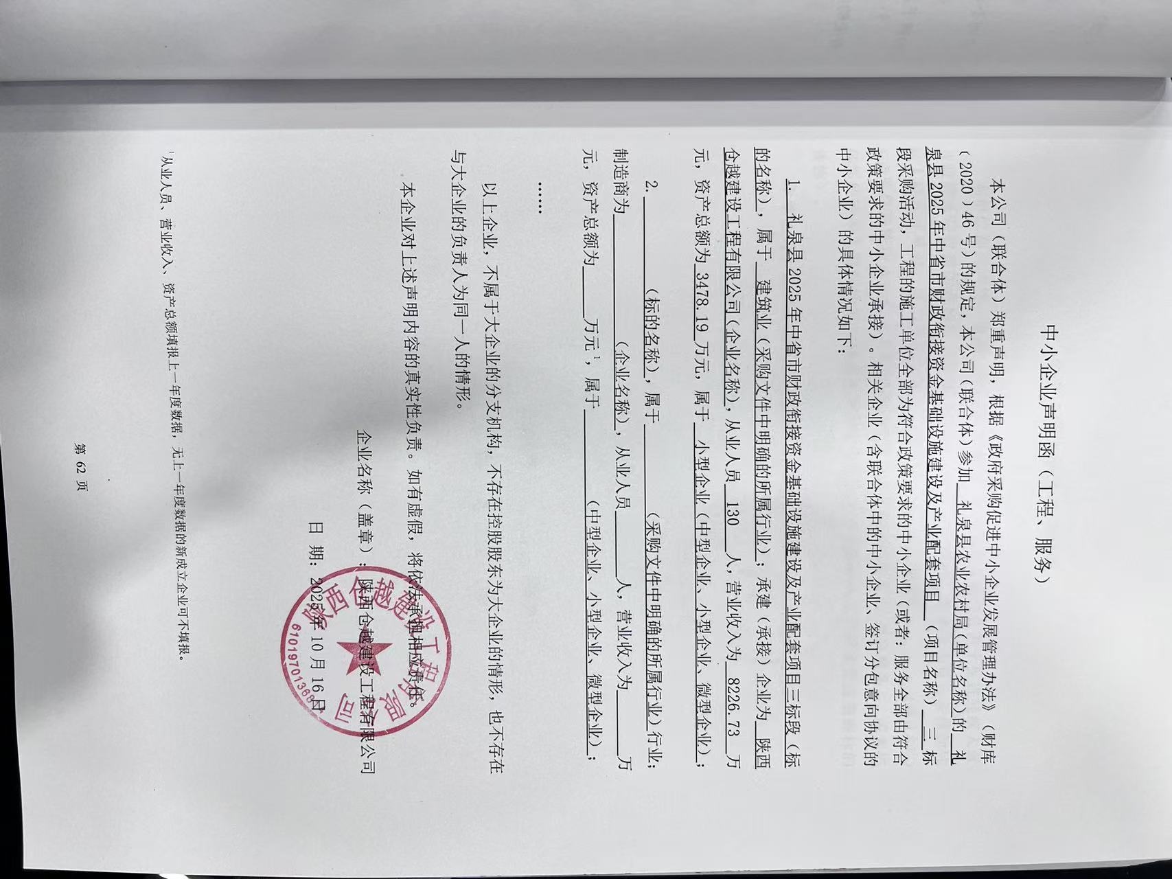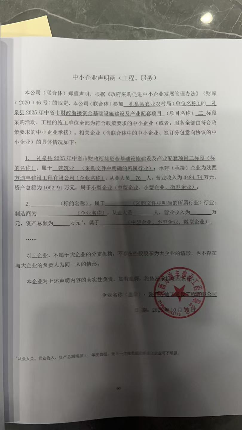 6 | 其他建筑工程 | 礼泉县2025年中省市财政衔接资金基础设施建设及产业配套项目六标段 | 详见采购文件 | 自合同签订之日起至 2025 年 12 月 31 日前完工 | 杨花妮 | 市政公用工程二级 注册建造师证书 注册证编号:陕 ******2128 | 3,537,620.12 |
