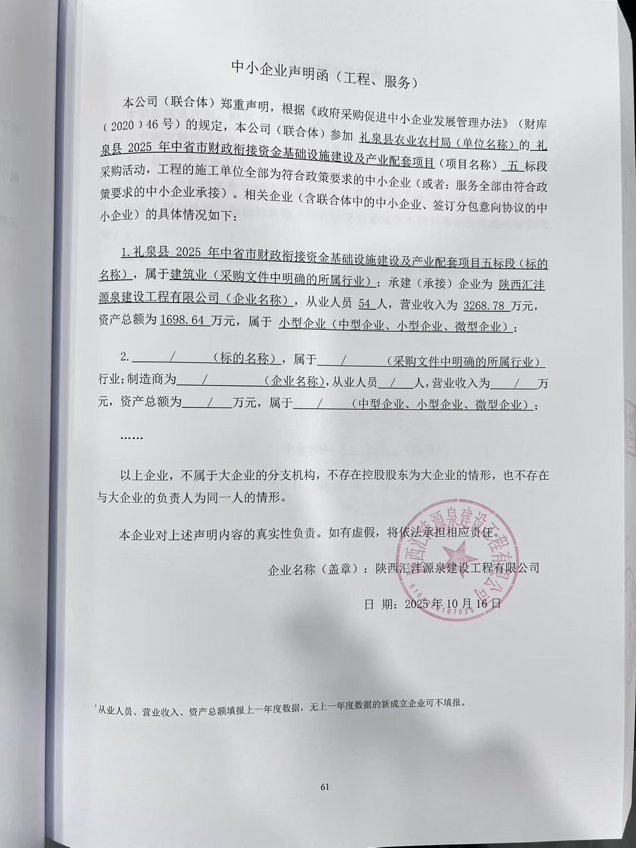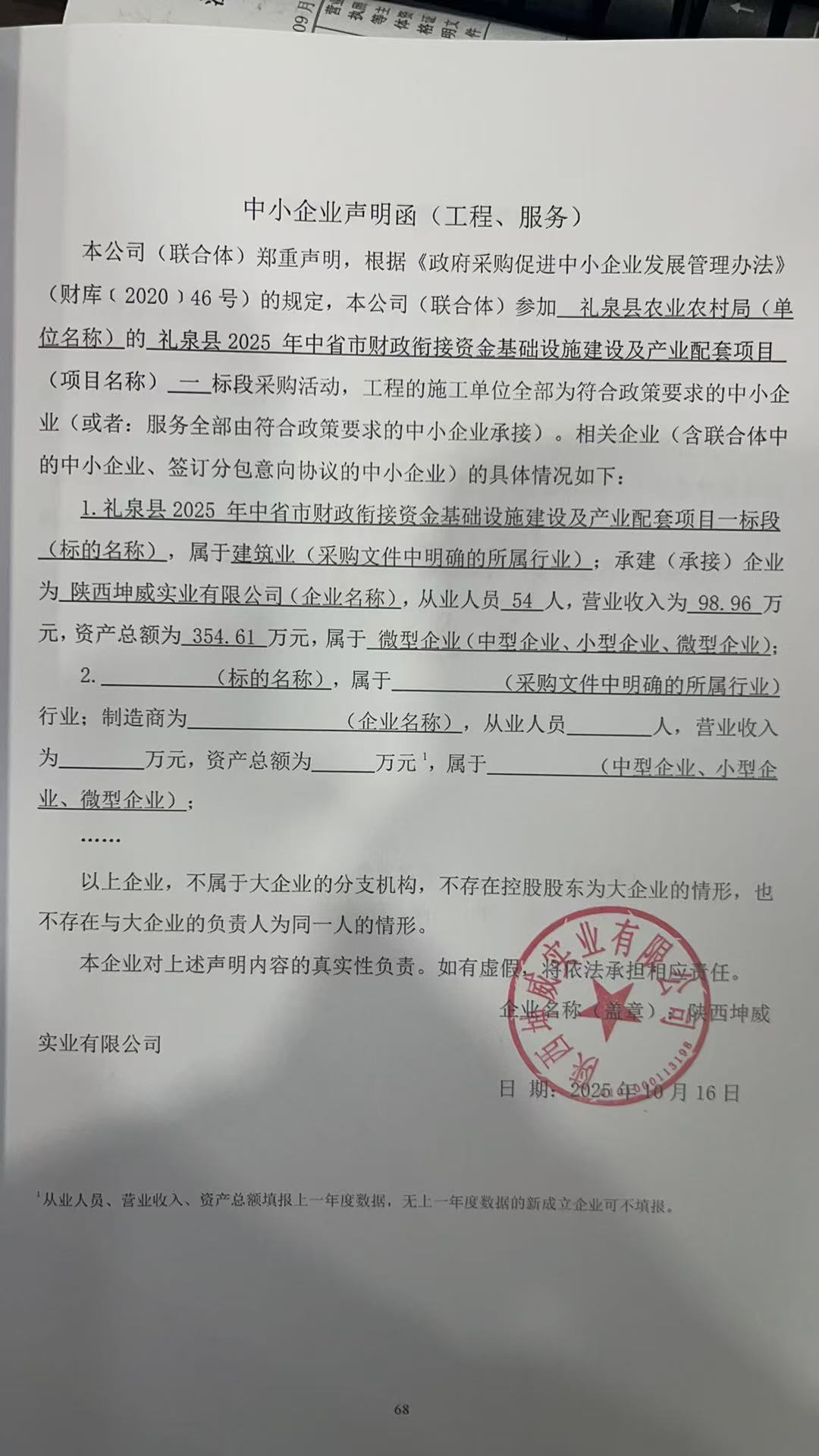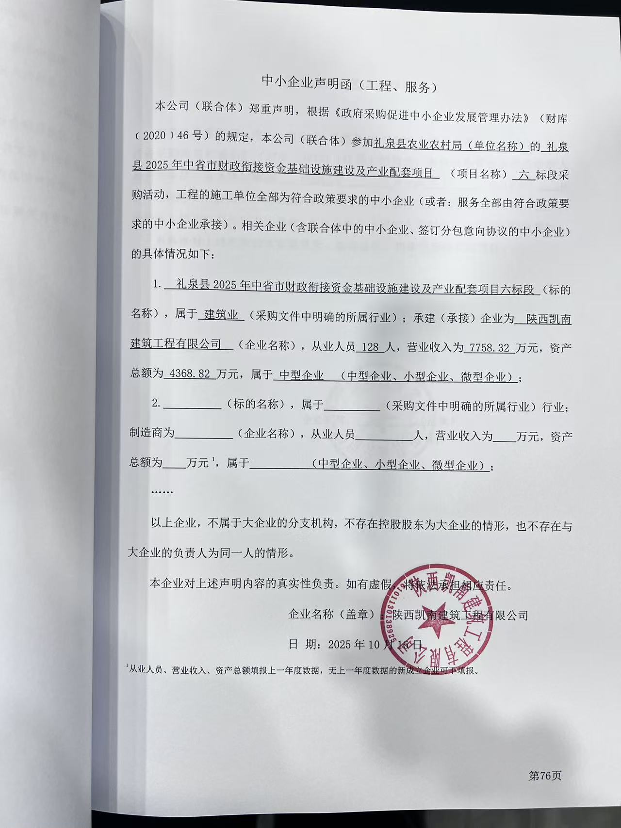 6 | 其他建筑工程 | 礼泉县2025年中省市财政衔接资金基础设施建设及产业配套项目六标段 | 详见采购文件 | 自合同签订之日起至 2025 年 12 月 31 日前完工 | 杨花妮 | 市政公用工程二级 注册建造师证书 注册证编号:陕 ******2128 | 3,537,620.12 |